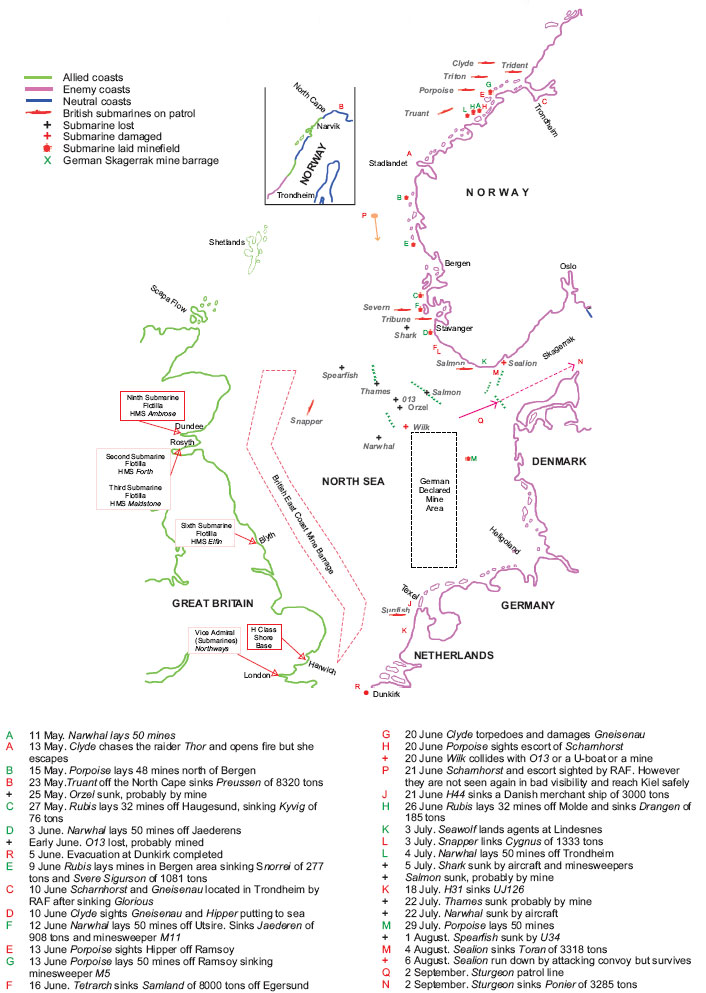 Map 10 Operations in the North Sea, Summer 1940 Positions of submarines on 21st June 1940 during the attempt to intercept the damaged Scharnhorst
