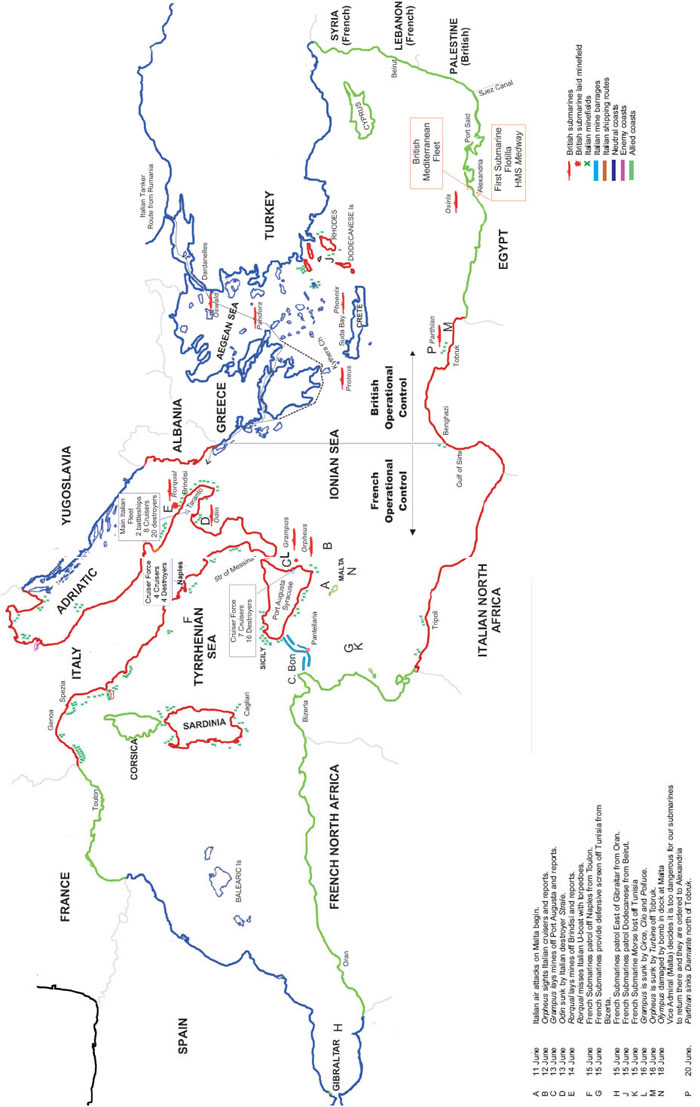 Map 11 The Mediterranean at the outbreak of war with Italy June 1940 Initial positions of submarines in mid June