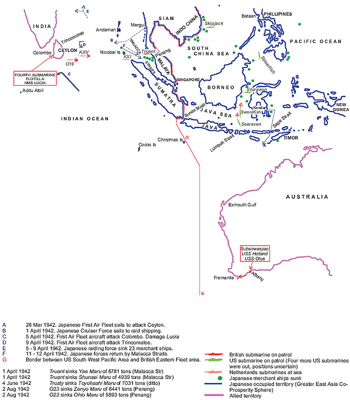 Map 23 The Far East after the loss of Singapore and the Dutch East Indies April - December 1942 Position of Submarines are for early April 1942
